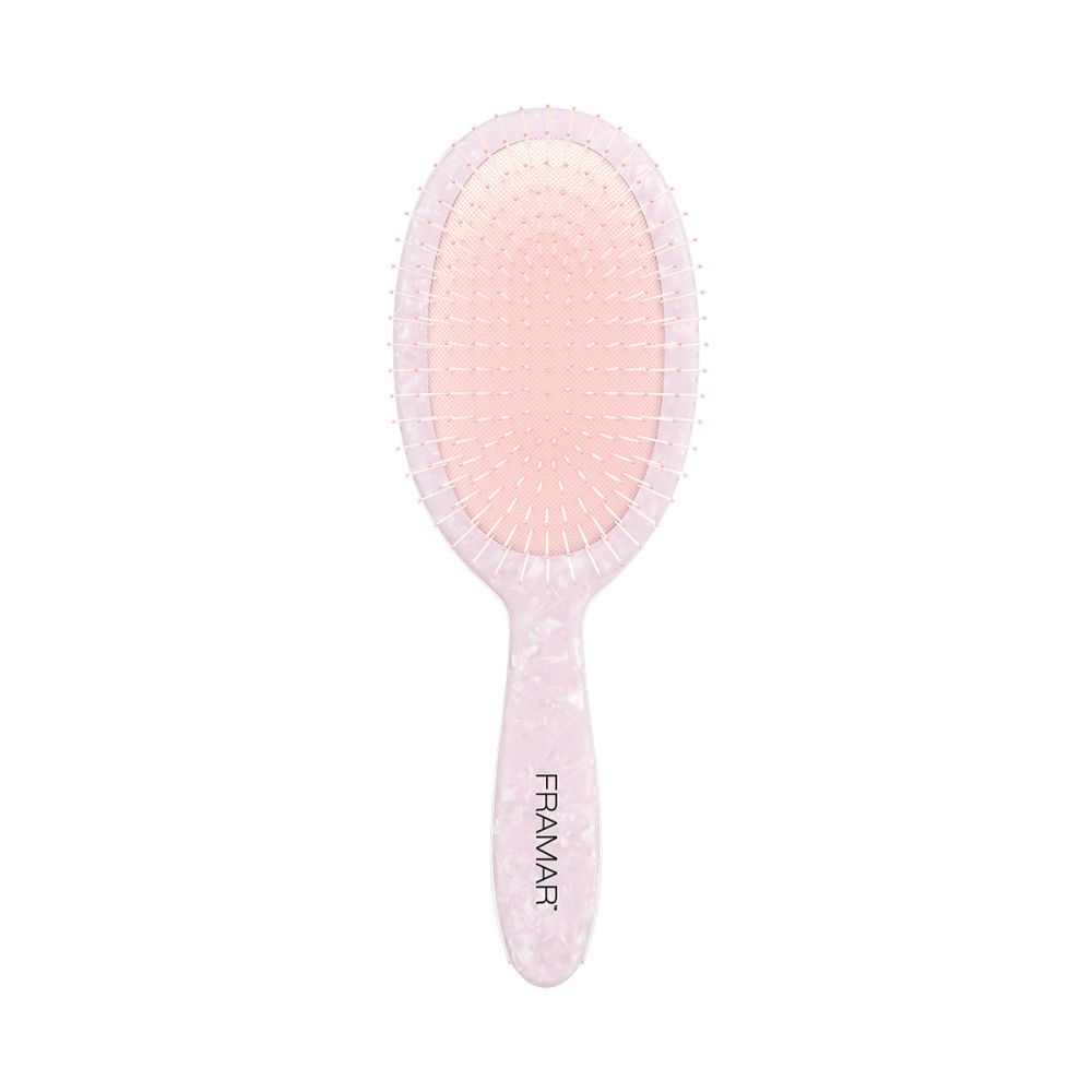 Kartáč Detangle Glazed Donut od Framar je určený pro každodenní rozčesávání suchých i mokrých vlasů všech typů. Jemné nylonové štětiny s měkkým polstrováním procházejí vlasy bez trhání a lámání a bez námahy rozmotají i silně zamotané vlasy. Díky nízké hmotnosti a ergonomickému tvaru se příjemně drží v ruce. Vhodný také pro prodloužené vlasy a paruky.