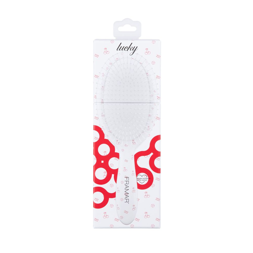Kartáč Lucky od Framar je oválný detangler (kartáč na rozčesávání) inspirovaný motivy tetování. Jemné a pružné nylonové štětiny s měkkým polstrováním procházejí vlasy bez trhání a bez bolesti, takže rozčesá i ty nejodolnější uzly na suchých i mokrých vlasech. Je vhodný pro všechny typy vlasů, včetně prodloužených vlasů a paruk. Díky nízké hmotnosti a ergonomickému tvaru se s ním příjemně pracuje.