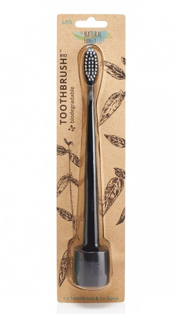 Zubní kartáček s černým stojánkem a měkkými nylonovými štětinami je šetrný vůči přírodě. Rukojeť je vyrobena z kukuřičného škrobu, který neobsahuje GMO. Rukojeť i obal produktu jsou biologicky rozložitelné, kompostovatelné.