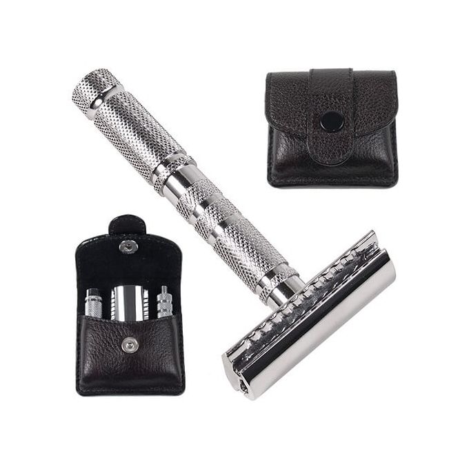 Praktický cestovní holicí strojek na žiletky je vyroben v celokovovém provedení a rozložený na 3 části, které jsou chytře uloženy v malém koženém pouzdře. Žiletka není součástí balení.